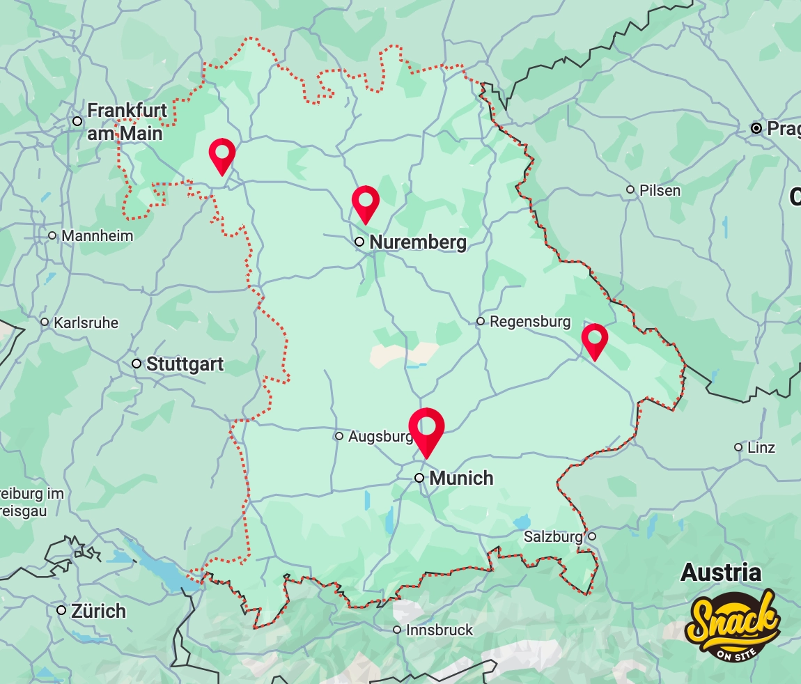 Ob in München, Nürnberg, Augsburg, Regensburg oder Ingolstadt – wir sind in ganz Bayern unterwegs und bringen unseren Pommeswagen zuverlässig zu Ihrem Wunschort.