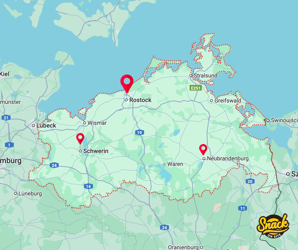Wir sind aktiv in Rostock, Schwerin, Neubrandenburg, Greifswald, Stralsund und Umgebung. Daher liefern wir unseren Pommeswagen auch in ländlichere Regionen – zuverlässig und flexibel.